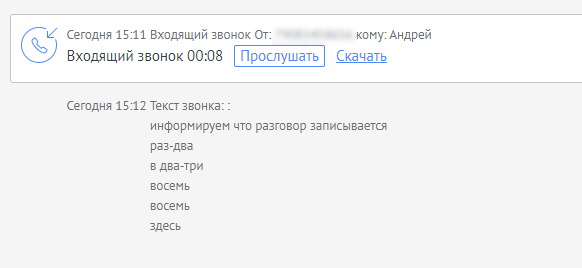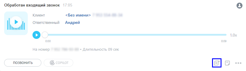 После того как транскрибация будет готова, вы сможете прочитать текст в карточке звонка.